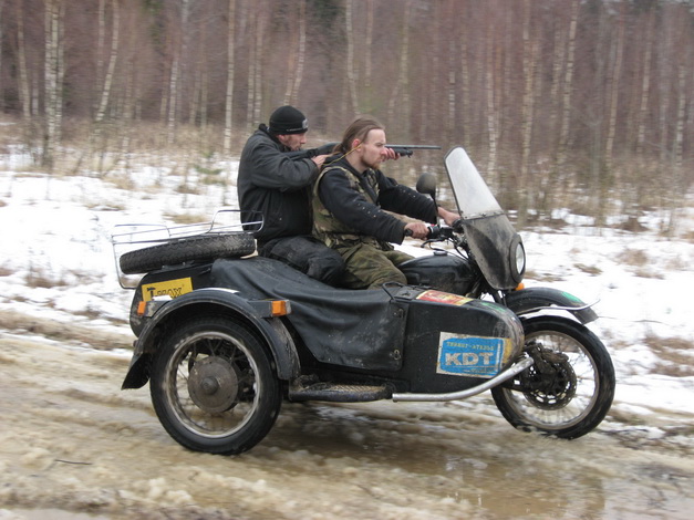 поскольку на колясочнике руль отпускать опасно, то решили, что стрелять будет пассажир, ну а чтобы жизнь мёдом не казалась, решено было делать это на бездорожье.